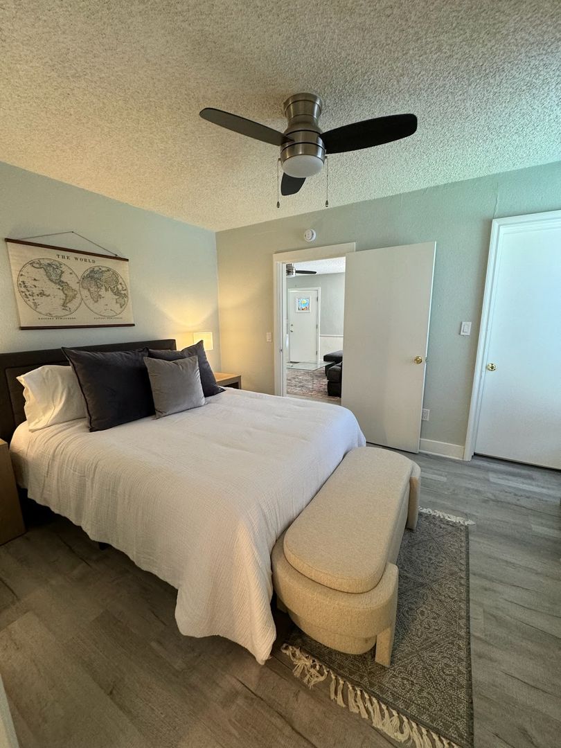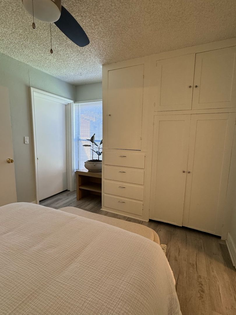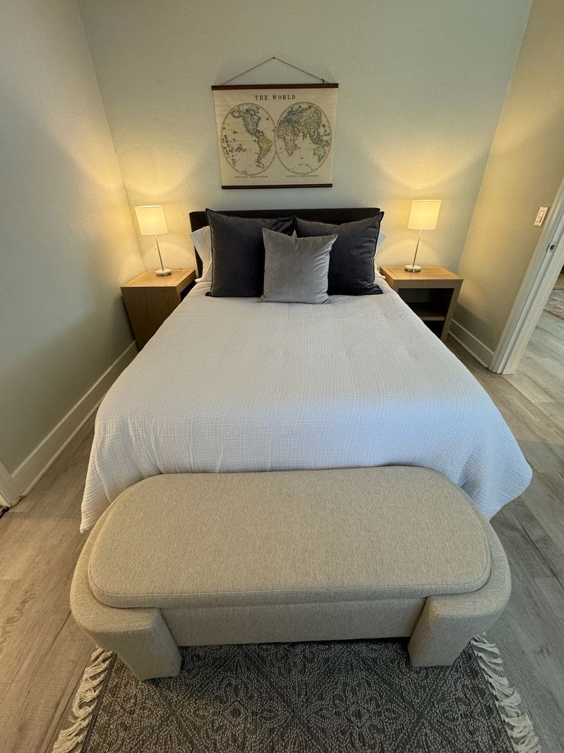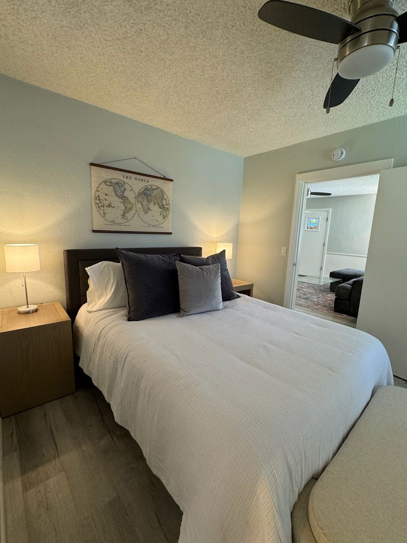 The inviting bedroom features a queen bed with plush new bedding, built-in cabinets for ample storage and a spacious walk-in closet. The full bathroom includes a tub and shower combo, bath towels and amenities.